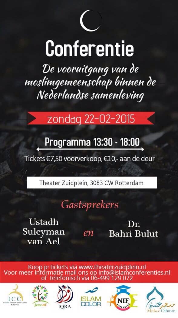 Zes van je favoriete Islamitische organisaties werken samen en presenteren een unieke conferentie in Theater Zuidplein met niemand minder dan Ustadh Sulayman van Ael en Dr. Bahri Bulut. De verkoop van de kaarten gaat hard! Als je aanwezig wilt zijn bij deze unieke conferentie adviseren wij je om snel je kaartjes te kopen want op = op! Koop hier je kaartjes: ‘Kaarten kopen | Theater Zuidplein‘. Voor algemene informatie volg de facebookpagina ‘Islamconferenties‘